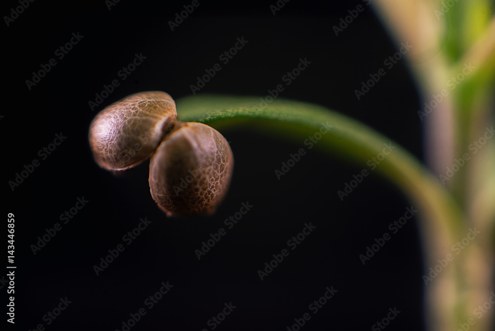 Cannabis sprout (dark angel marijuana strain) with a seed shell attached to a leaf