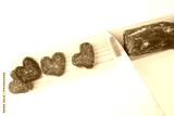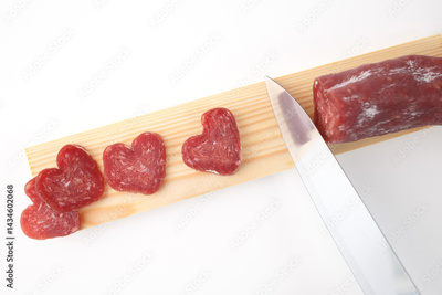 Sliced heart-shaped piece of cured sausage with knife on white background. Valentines Day food concept for gourmet shop, restaurant branding, social media marketing, culinary magazine. Flat lay