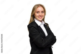 Professional young woman exudes confidence in tailored suit during formal business setting