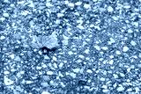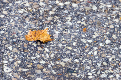 Autumn maple leaf fallen onto rocky pavement, background with space for text