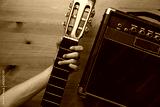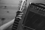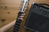 Guitar amplifier and woman hand holding a guitar on wood table