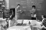 Teacher explaining properties of molecules using digital display while students engaging with laptops in a classroom setting environment