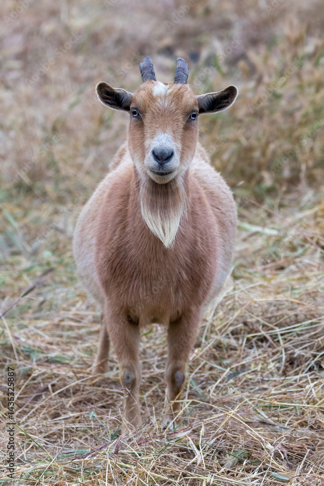 An Adopted or rescued Goat grazing in urban areas to reduce fire risk and sustain land management. Sunnyvale Baylands, Santa Clara County, California.