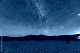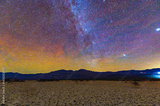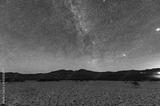 The Milky Way arches over cracked desert ground and mountains in Death Valley National Park under a clear night sky.