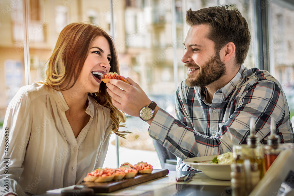 Cute Hispanic young couple having a good time together and sharing food in a coffee shop