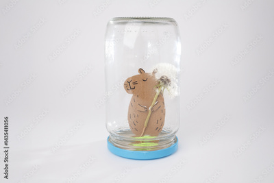 Creative eco-friendly capybara figure holding dandelion inside inverted glass jar with blue lid, perfect handmade gift idea for kids crafts, Mothers Day campaigns, sustainable lifestyle brands