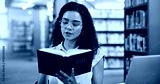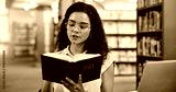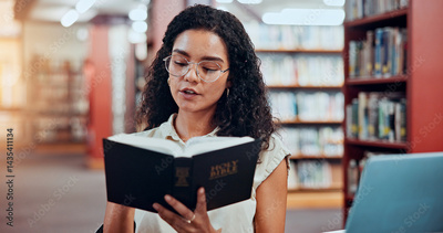 Woman, bible study and reading at library for learning for theology assessment at university. Girl, college student and research with religion, history and book for project, scholarship or education