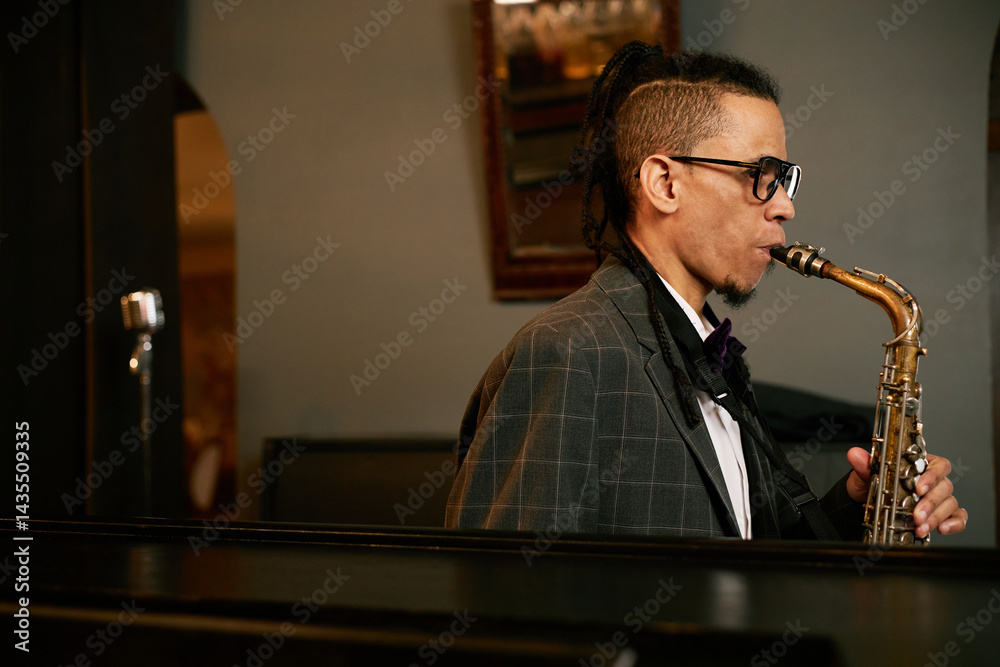 Reflection in mirror of multiracial male saxophonist suit with bow tie performing music on brass instrument, rehearsing before live jam session in dimly lit jazz club