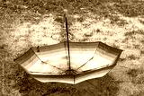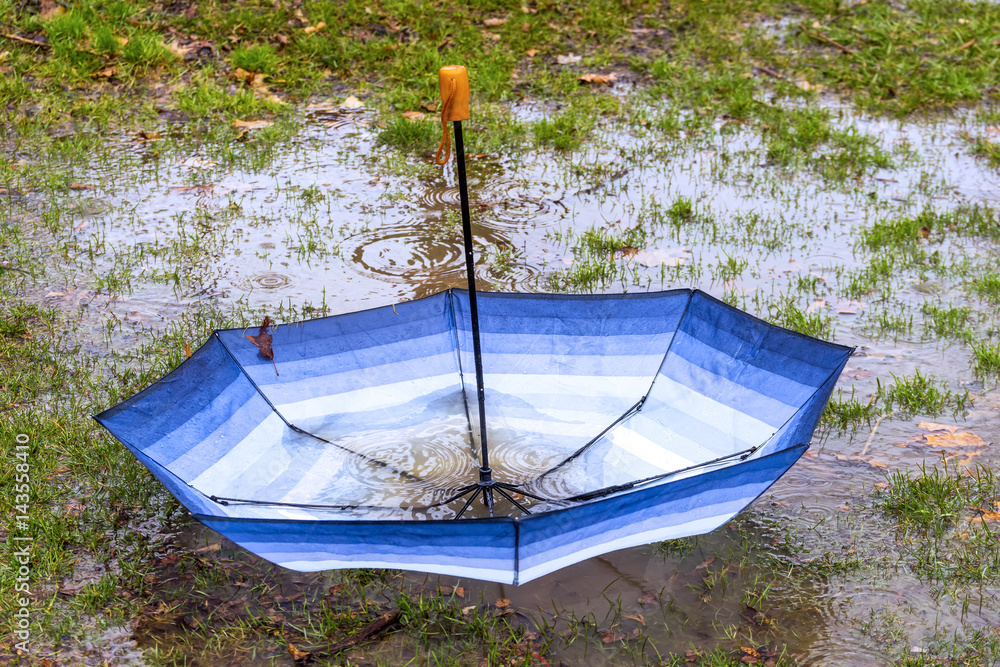 Upside down umbrella floating in a puddle collecting rain and leaves in a spring storm