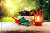 Still life with flowers and a lamp and gloves and pruner on a wooden table in the garden. Garden tools in spring time.