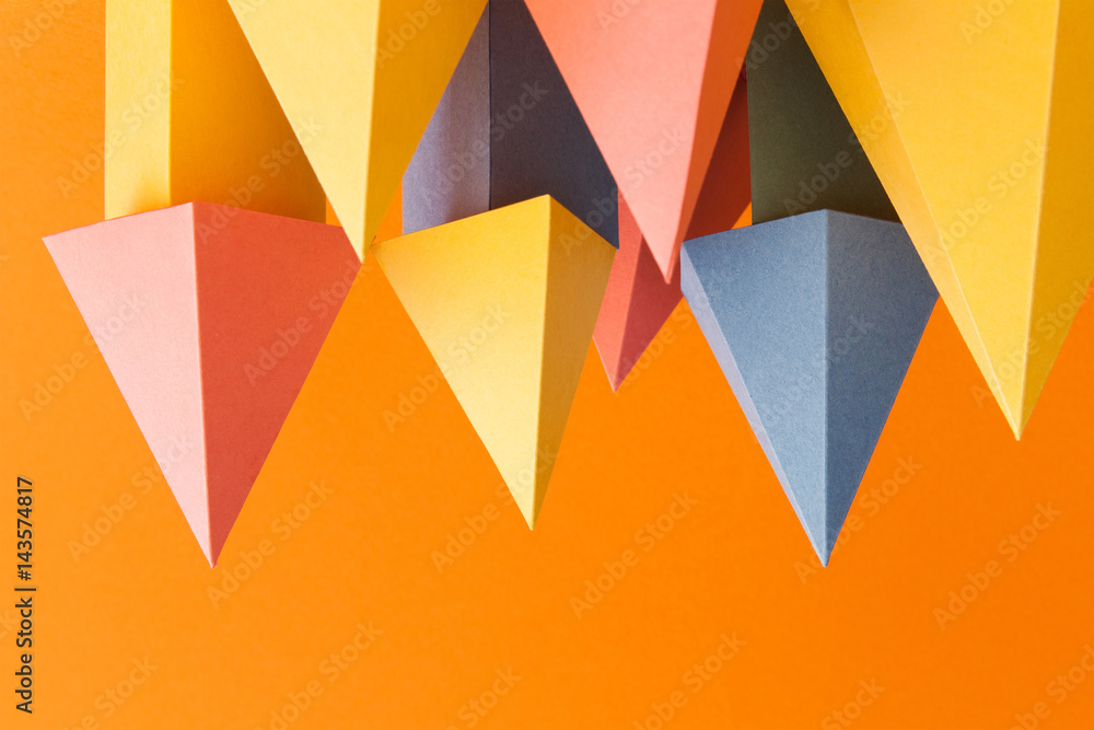 Abstract colorful geometrical shapes background. Three-dimensional prism pyramid objects on orange paper. Yellow blue pink green colored solid figures, soft focus photo
