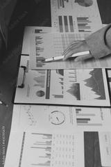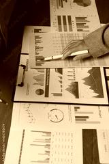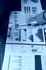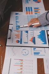 Group of confident business people point to graphs and charts to analyze market data, balance sheet, account, net profit to plan new sales strategies to increase production capacity.