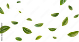 Green tea leaves flying in the air isolated on background.