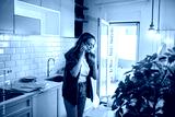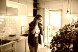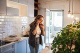 Woman talking on smartphone while unpacking boxes in new kitchen
