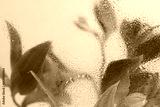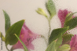 Smoke Soft focus green, pink leaf and flower bouquet through glass with wet water drops. Abstract natural blur beige background.