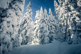 Incredible image of snow-covered fir trees after a snowfall in cold weather. Photo wallpaper.