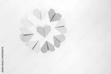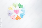 Bright origami hearts arranged in a circular layout on pastel paper. Flat lay of a creative craft project for DIY lovers, stationery brands, school education, and handmade card design
