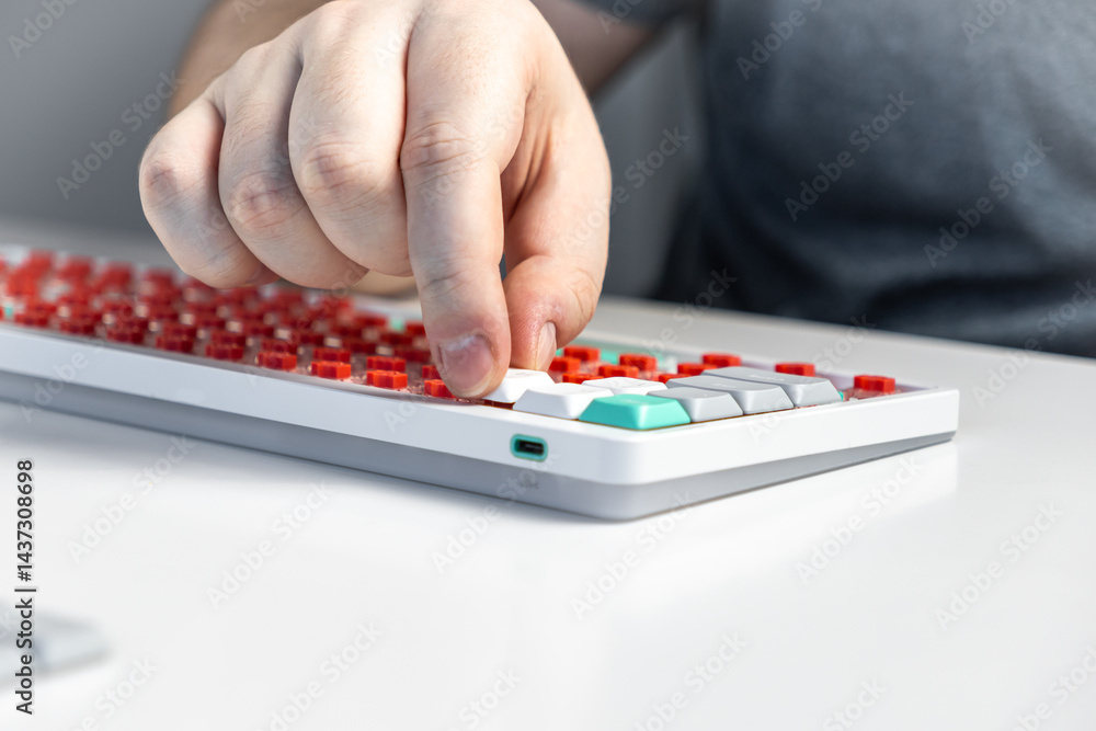 Person assembling mechanical keyboard by pressing white keycap onto red switch component