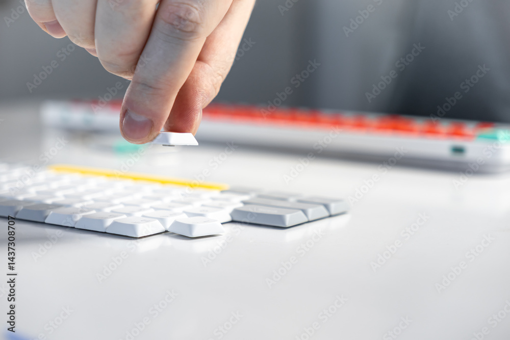 Person removing white keycap from minimalist keyboard during switch maintenance or upgrade