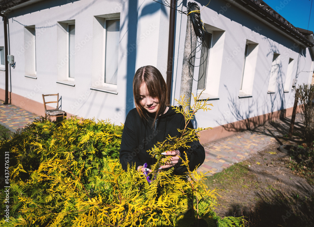 Woman gardening in the yard of her house on a beautiful sunny day tending to plants