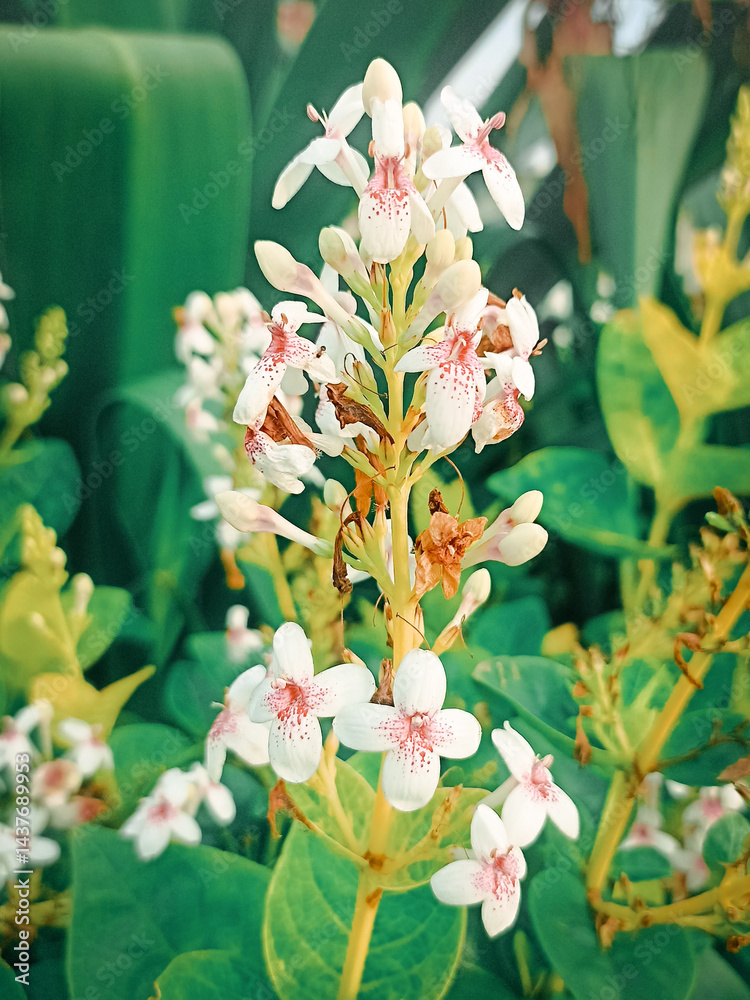 Blooming Pseuderanthemum carruthersii var. reticulatum flower showcasing vibrant petals and lush foliage, radiating tropical charm and natural elegance under sunlight