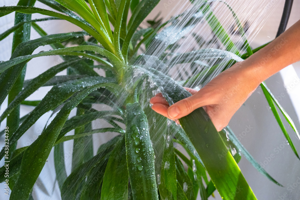 Yucca dracaena houseplant it stands under water jets in bathroom for washing. Care of potted plants, watering, dusting, humidification