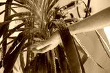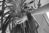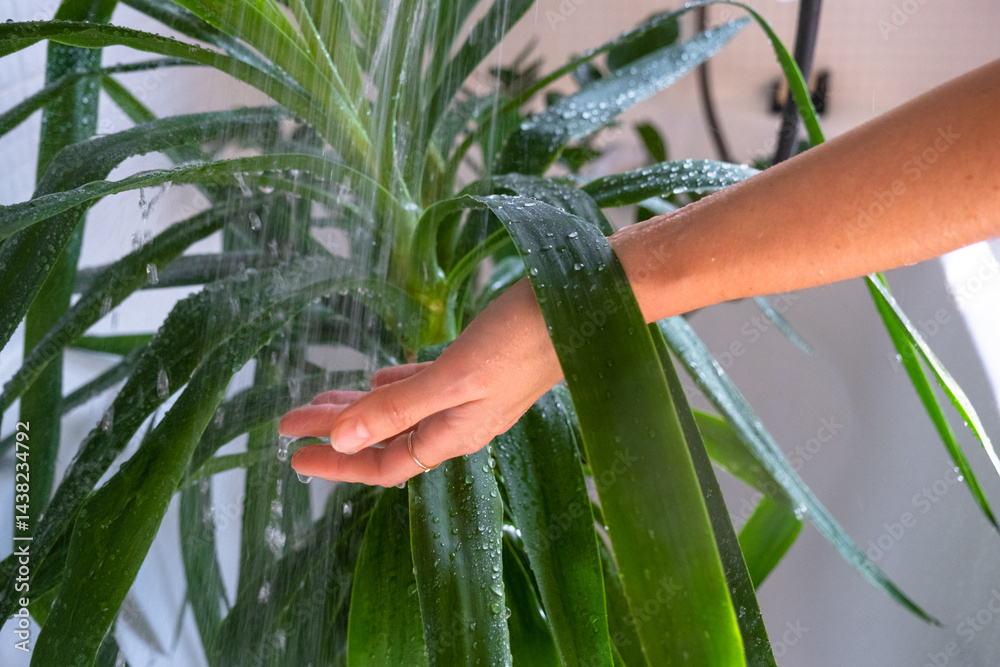 Yucca dracaena houseplant it stands under water jets in bathroom for washing. Care of potted plants, watering, dusting, humidification