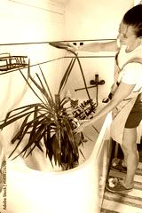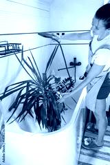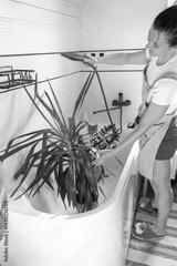 A woman in an apron washes the yucca, dracaena houseplant from the shower in the bathroom. Care of potted plants, watering, dusting, humidification