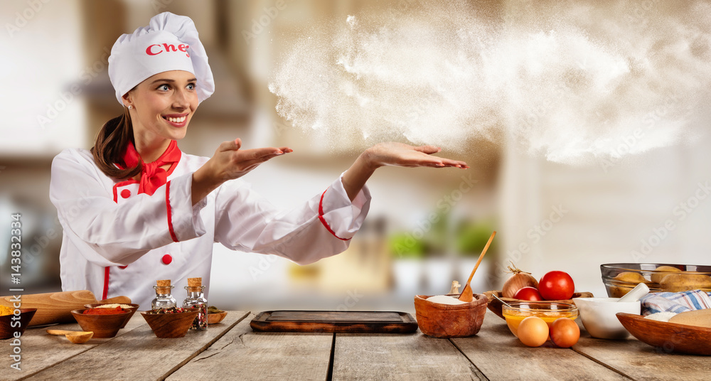 Young chef woman cooker pointing