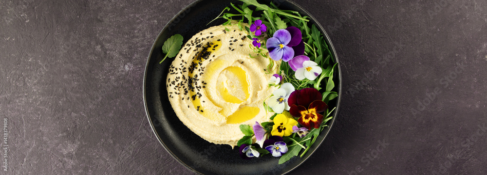 Gourmet Hummus with Edible Flowers and Olive Oil on Dark Background
