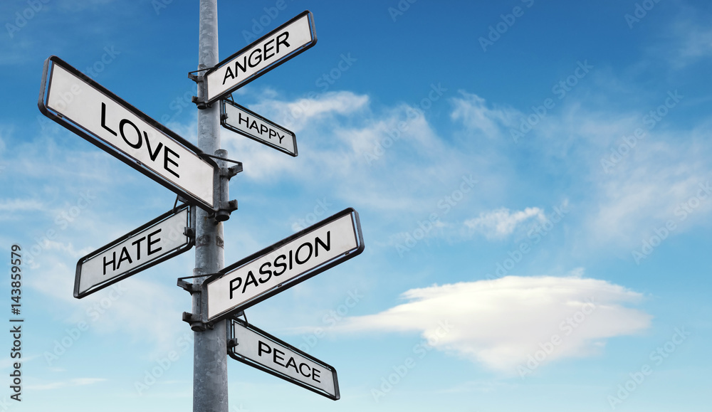 Human feelings and emotions on sign post, on blue sky with white clouds backgrounds