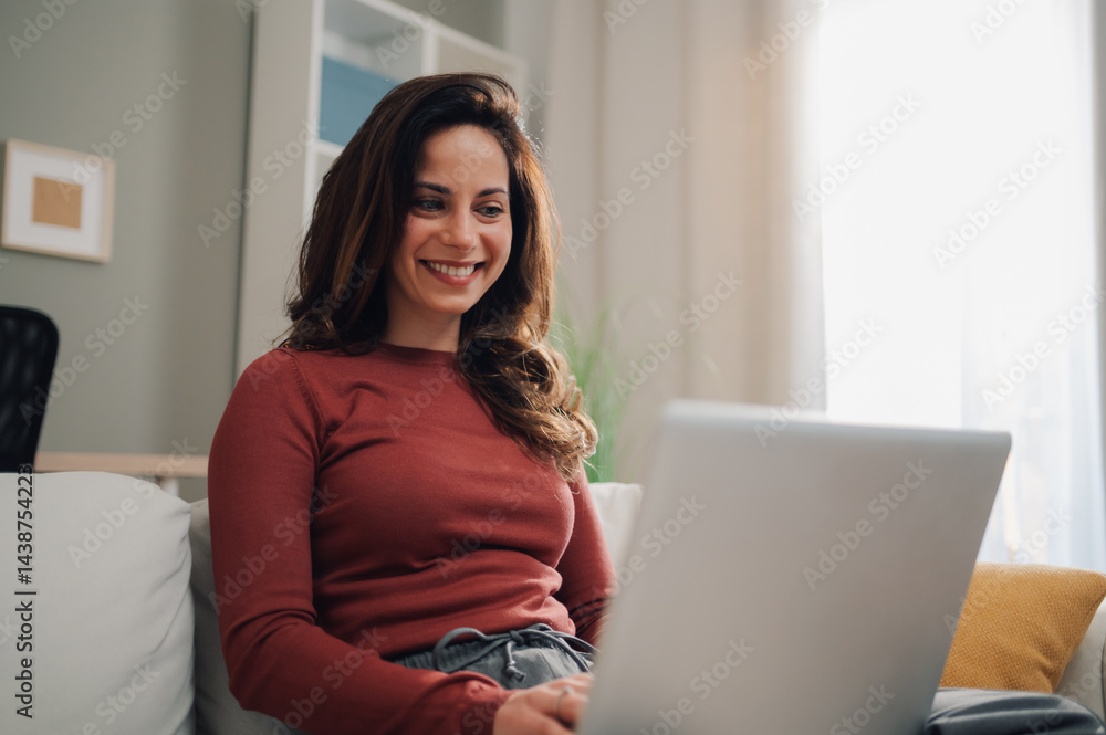 Smiling woman working from home using laptop on sofa