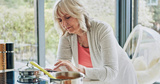 Cooking, woman and phone in kitchen with recipe, online text and food planning in a home. Stove, web and house with mobile and social media scroll with meal and dinner with app and vegan diet ideas