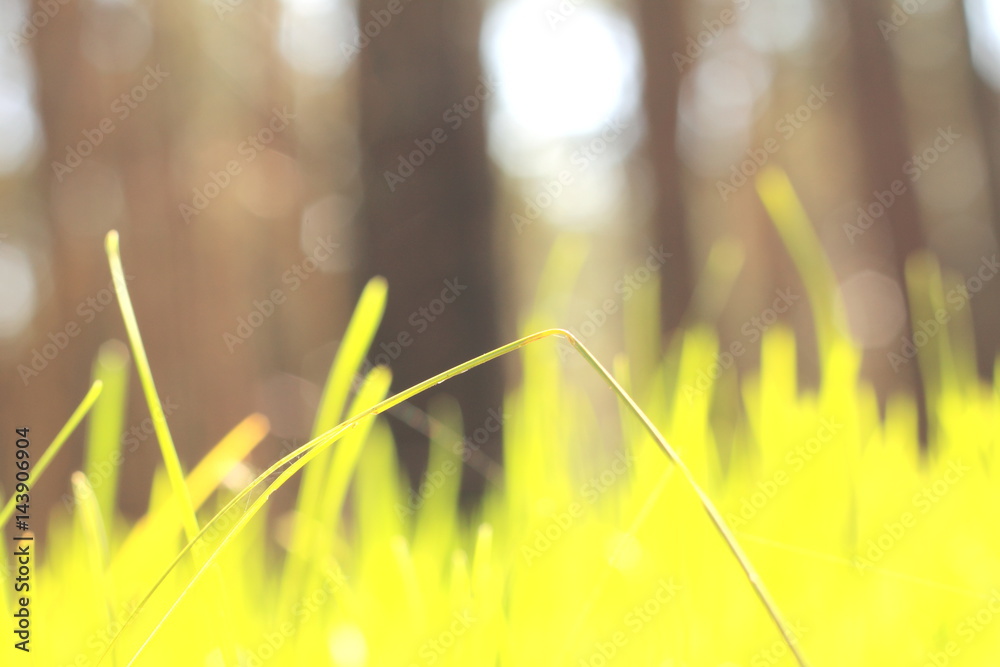 Abstract summer landscape with green grass on a forest background / blur of sharpness and bokeh