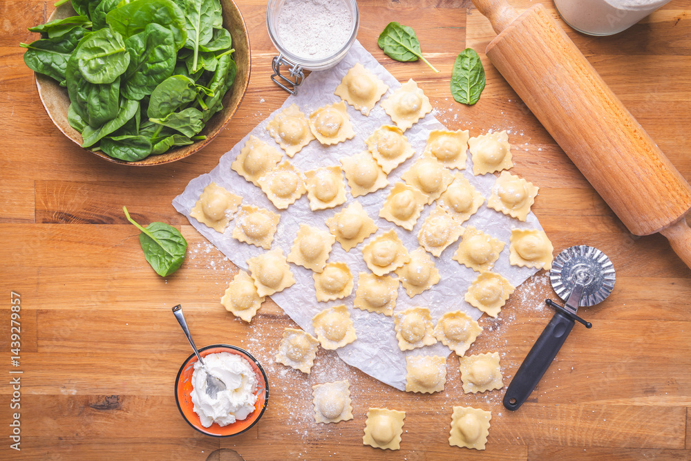 Raw ravioli, Italian pasta, filled with spinach and feta cheese