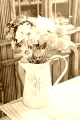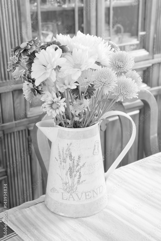 Spring flowers in watering can on country dining table, light and airy black and white art composition