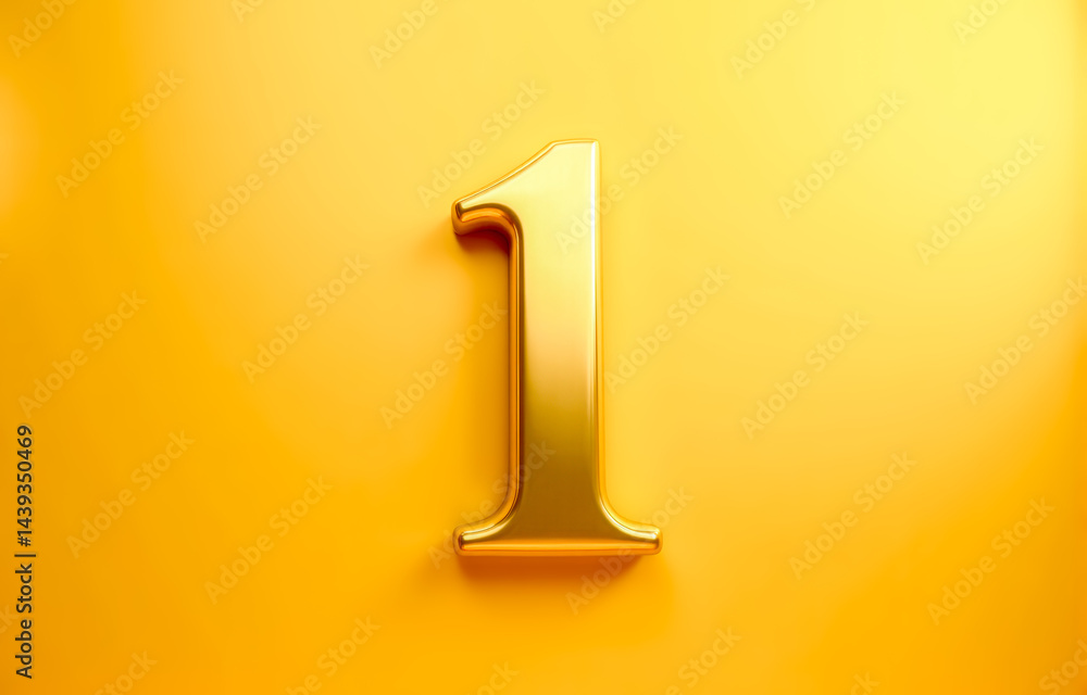 Glossy golden number one 1 with realistic shadow on vibrant yellow wall representing business leadership, ranking, high quality or top position. 3d illustration