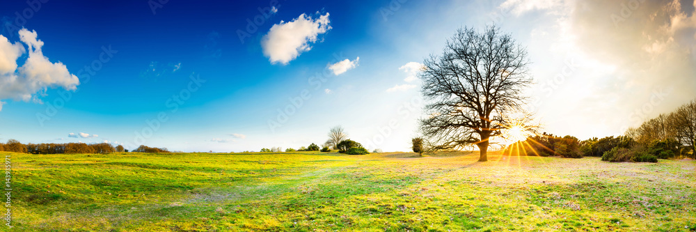 Weite Landschaft mit grüner Wiese bei Sonnenuntergang
