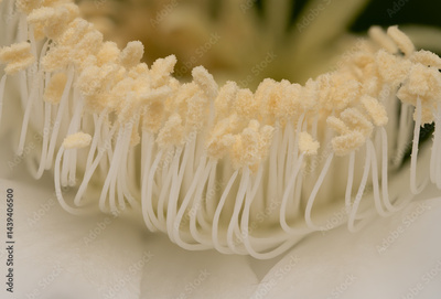 Close-up of White Cactus Bloom Stamens and Pistils, Detailed Floral Structure