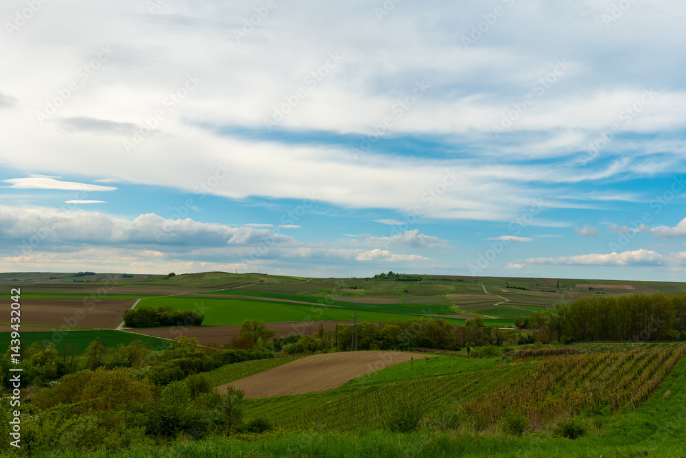 Vast rolling hills adorned with vibrant green fields under a dramatic sky near a tranquil countryside village at midday