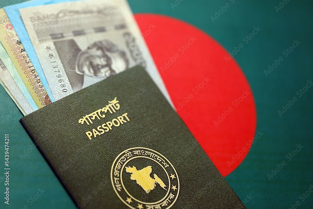 Bangladeshi taka money bills in big amount and passport lies on Bangladesh flag close up