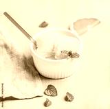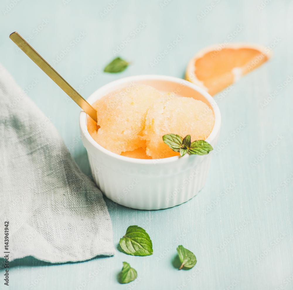 Pink grapefruit homemade sorbet with fresh mint leaves in white bowl over blue painted background, selective focus. Fresh healthy raw vegan summer dessert concept