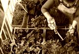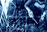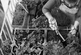 Frau pflanzt Gemüse und Kräuter im Hochbeet am Balkon