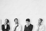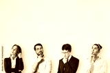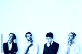 Group of thoughtful business people looking up against light background with copy space, concept of brainstorming and innovation idea generation.