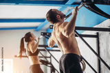 Fitness toes to bar men and woman pull-ups tree bars workout exercise at gym