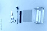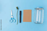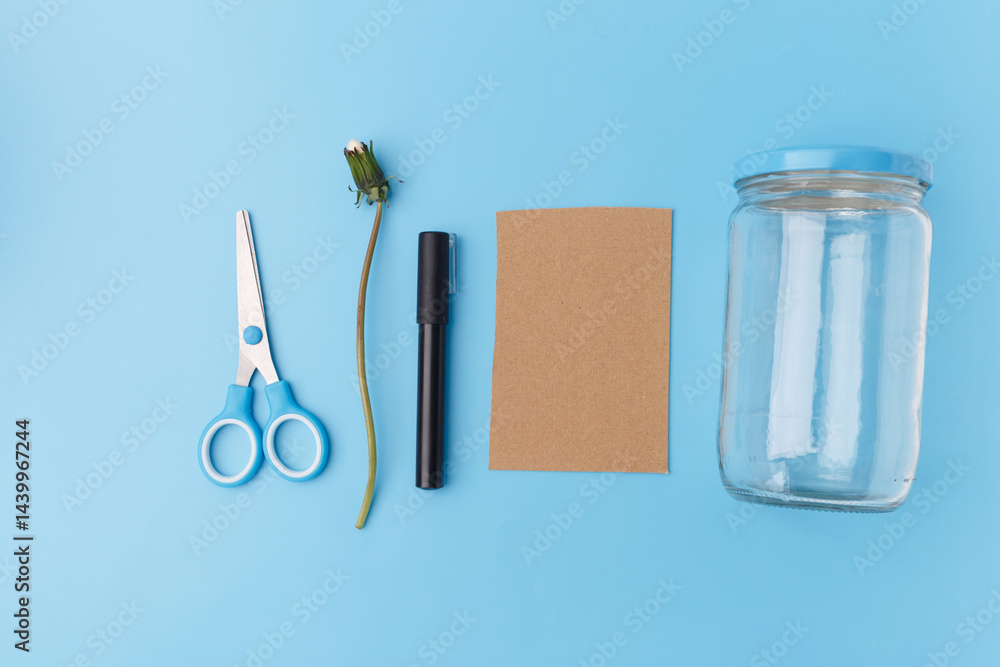 Creative DIY project materials scissors cardboard black marker dandelion glass jar on blue background, perfect for craft workshops, recycling campaigns, kids education, eco-friendly brands,