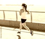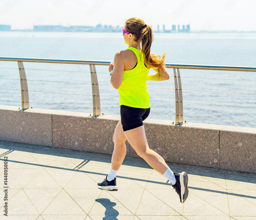 Runner enjoying a sunny day along the waterfront promenade, embracing fitness and nature