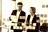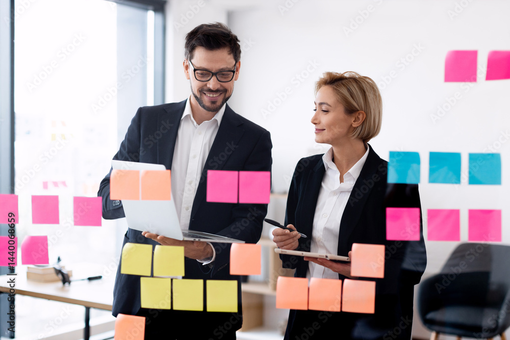 Team of male and female professionals collaborating on brainstorm with sticky notes, modern workspace