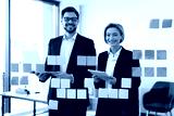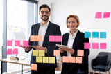 Two adult business professionals using sticky notes on glass board for brainstorming session. Concept of teamwork collaboration and strategizing in office setting featuring multicultural human models