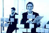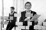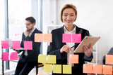 Confident adult woman interacting with sticky notes on glass with teamwork environment focus